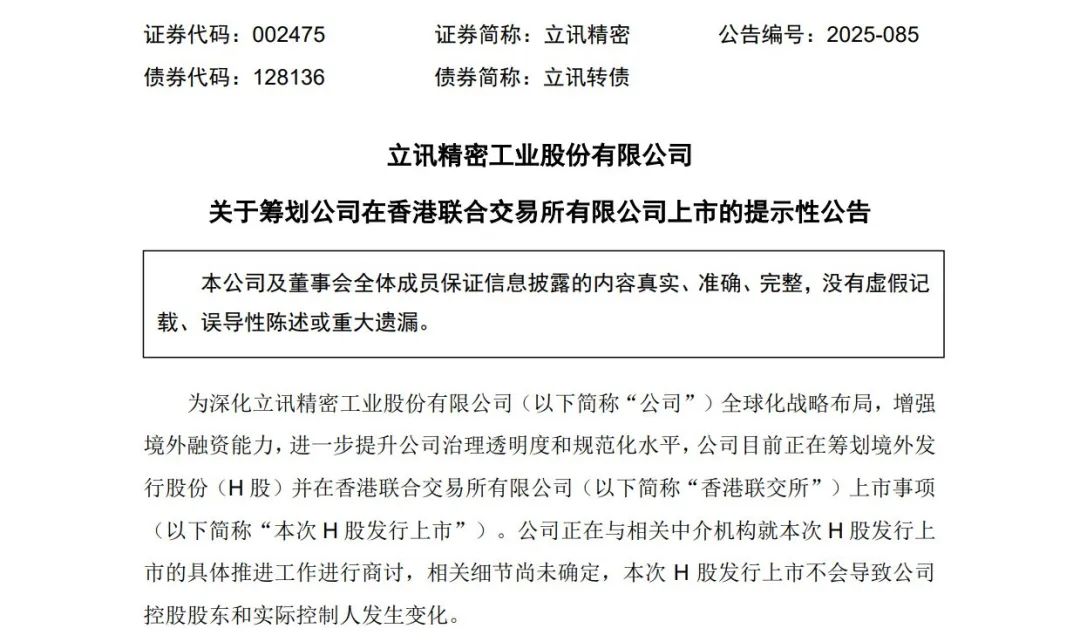 立讯精密表示,为深化公司全球化战略布局,增强境外融资能力,进一步提升公司治理透明度和规范化水平,公司目前正在筹划境外发行股份(H股)并在香港联交所上市事项。公司正在与相关中介机构就本次H股发行上市的具体推进工作进行商讨,相关细节尚未确定,本次H股发行上市不会导致公司控股股东和实际控制人发生变化。