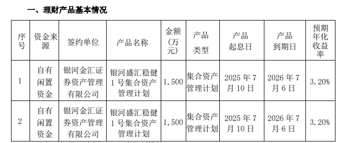 (300610)公告称,近日公司及子公司使用自有闲置资金购买了3,000万元的理财产品。到期日均为2026年7月6日,预期年化收益率均为3.20%。