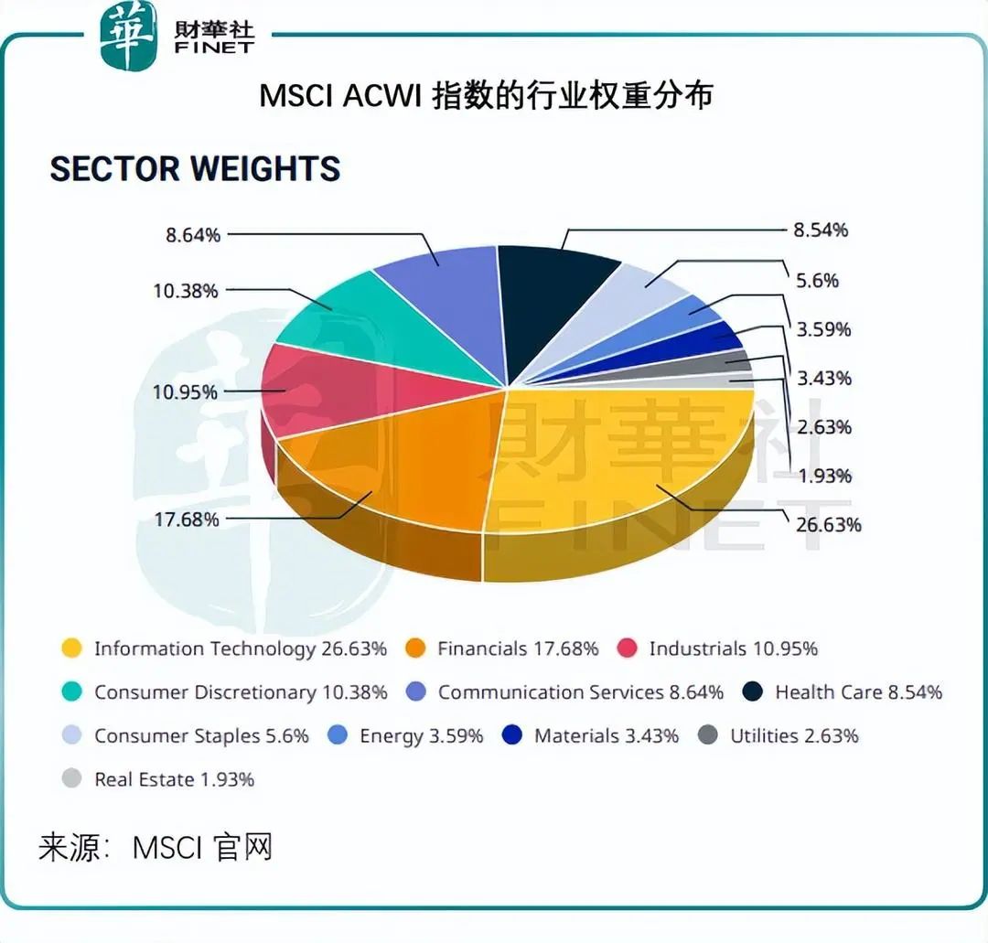 MSCI ACWI指数的十大成分股全部为美国上市公司,除了占权重1.12%排名第八的中概股台积电(TSM.US)外,其余皆为美国企业,这十大权重股分别为市值最高的英伟达(NVDA.US)、微软(MSFT.US)、苹果(AAPL.US)、亚马逊(AMZN.US)、META(META.US)、博通(AVGO.US)、谷歌母公司Alphabet-A类股(GOOGL.US)、台积电、Alphabet-C类股(GOOG.US)以及特斯拉(TSLA.US)。
