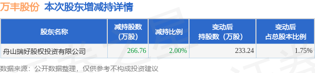 证券之星消息,8月18日万丰股份发布公告《万丰股份:特定股东减持股份结果公告》,其股东舟山瑞好股权投资有限公司于2025年8月15日合计减持266.76万股,占公司目前总股本的2.0%,变动期间该股股价下跌0.53%,截止8月15日收盘报16.98元。