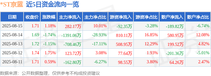 8月15日的资金流向数据方面,主力资金净流入282.17万元,占总成交额10.01%,游资资金净流出92.35万元,占总成交额3.28%,散户资金净流出189.82万元,占总成交额6.74%。