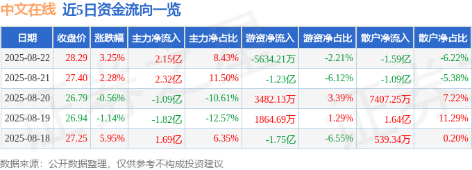 8月22日的资金流向数据方面,主力资金净流入2.15亿元,占总成交额8.43%,游资资金净流出5634.21万元,占总成交额2.21%,散户资金净流出1.59亿元,占总成交额6.22%。