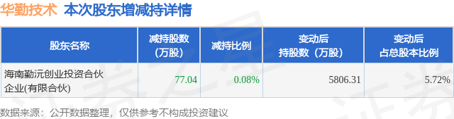 证券之星消息,8月29日华勤技术发布公告《华勤技术:华勤技术关于持股5%以上的股东权益变动触及1%刻度的提示性公告》,其股东海南勤沅创业投资合伙企业(有限合伙)于2025年8月28日至2025年8月29日间合计减持77.04万股,占公司目前总股本的0.0758%,变动期间该股股价上涨2.51%,截止8月29日收盘报98.35元。
