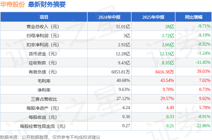 据证券之星公开数据整理,近期华帝股份(002035)发布2025年中报。截至本报告期末,公司营业总收入28.0亿元,同比下降9.71%,归母净利润2.72亿元,同比下降9.19%。按单季度数据看,第二季度营业总收入15.4亿元,同比下降10.44%,第二季度归母净利润1.66亿元,同比下降5.57%。本报告期华帝股份盈利能力上升,毛利率同比增幅7.02%,净利率同比增幅0.73%。