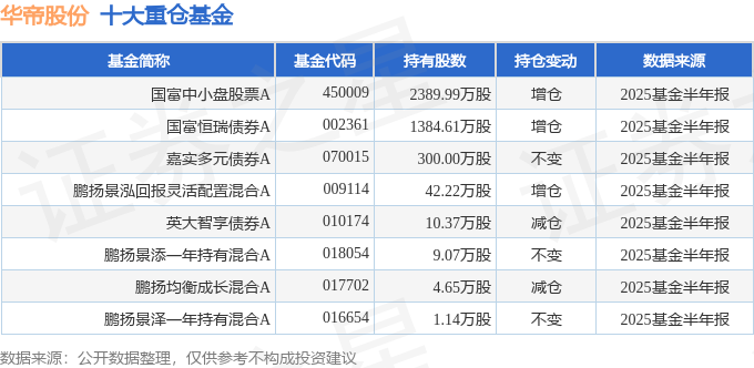 持有华帝股份最多的基金为国富中小盘股票A,目前规模为30.17亿元,最新净值2.7285(8月29日),较上一交易日上涨0.12%,近一年上涨33.34%。该基金现任基金经理为赵晓东。