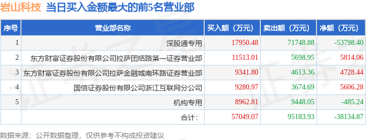 证券之星消息,沪深交易所2025年9月4日公布的交易公开信息显示,岩山科技(002195)因日跌幅偏离值达到7%的前5只证券登上龙虎榜。此次是近5个交易日内第3次上榜。