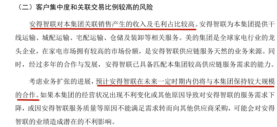 对于上述问题,美的在4月底的一份分拆预案中直接表示:“安得智联对本集团关联销售产生的收入及毛利占比较高。”