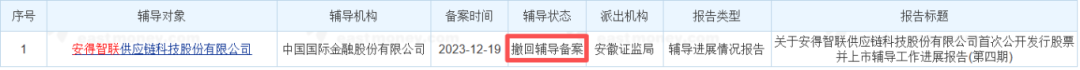 2023年12月,中金公司代表安得智联向中国证监会安徽监管局递交上市前辅导备案。