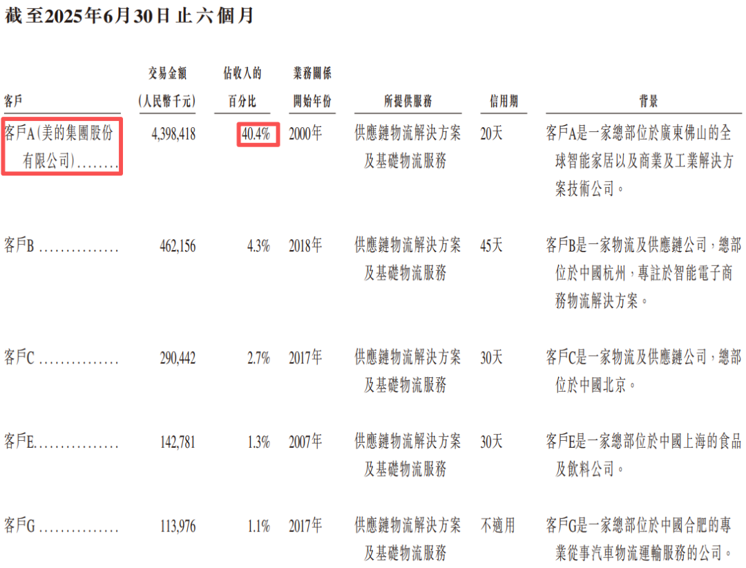过去三年及今年上半年,安得智联前五大客户贡献收入占比分别为49.8%、48.6%、52.1%及49.7%,约占公司同期收入的一半。
