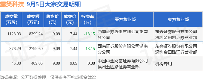 证券之星消息,9月5日露笑科技发生大宗交易,交易数据如下: