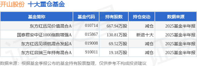 根据2025基金半年报公募基金重仓股数据,重仓该股的公募基金共4家,其中持有数量最多的公募基金为东方红资产管理的东方红远见价值混合A。东方红远见价值混合A目前规模为12.89亿元,最新净值1.1012(9月4日),较上一交易日下跌1.56%,近一年上涨42.55%。该公募基金现任基金经理为周杨。周杨在任的基金产品包括:东方红启瑞三年持有混合A,管理时间为2023年10月28日至今,期间收益率为13.03%;东方红远见领航混合发起A,管理时间为2023年11月16日至今,期间收益率为14.67%;东方红远见精选混合A,管理时间为2025年3月5日至今,期间收益率为22.68%。