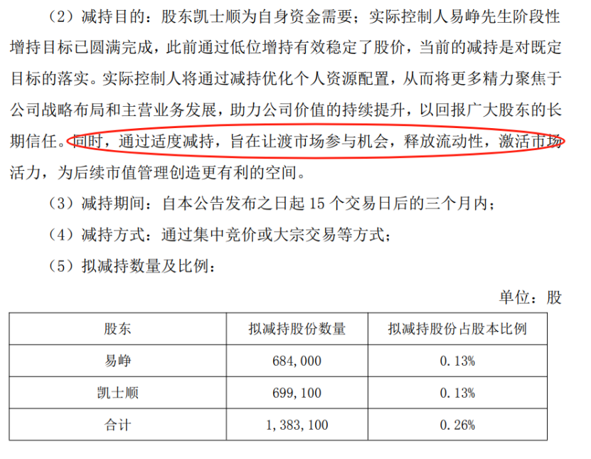 对于减持目的,公告表示,实际控制人易峥阶段性增持目标已圆满完成,此前通过低位增持有效稳定了股价,当前的减持是对既定目标的落实。实际控制人将通过减持优化个人资源配置,从而将更多精力聚焦于公司战略布局和主营业务发展,助力公司价值的持续提升,以回报广大股东的长期信任。同时,通过适度减持,旨在让渡市场参与机会,释放流动性,激活市场活力,为后续市值管理创造更有利的空间。