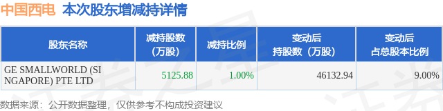证券之星消息,9月9日中国西电发布公告《中国西电:中国西电关于持股5%以上股东权益变动触及1%刻度的提示性公告》,其股东GE SMALLWORLD (SINGAPORE) PTE LTD于2025年8月28日至2025年9月8日间合计减持5125.88万股,占公司目前总股本的1.0%,变动期间该股股价下跌1.36%,截止9月8日收盘报6.53元。