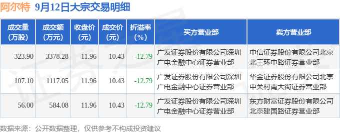 证券之星消息,9月12日阿尔特发生大宗交易,交易数据如下:
