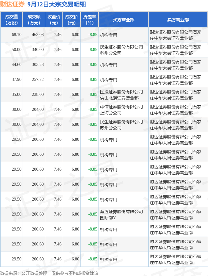 证券之星消息,9月12日财达证券发生大宗交易,交易数据如下: