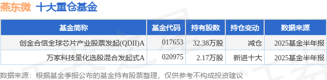 根据2025基金半年报公募基金重仓股数据,重仓该股的公募基金共2家,其中持有数量最多的公募基金为创金合信基金的创金合信全球芯片产业股票发起(QDII)A。创金合信全球芯片产业股票发起(QDII)A目前规模为0.34亿元,最新净值1.5707(9月10日),较上一交易日上涨0.0%,近一年上涨40.05%。该公募基金现任基金经理为刘扬。刘扬在任的基金产品包括:创金合信芯片产业股票发起A,管理时间为2021年10月11日至今,期间收益率为16.03%;创金合信软件产业股票发起A,管理时间为2022年9月29日至今,期间收益率为22.5%;创金合信沪港深精选混合,管理时间为2025年9月3日至今,期间收益率为1.43%。