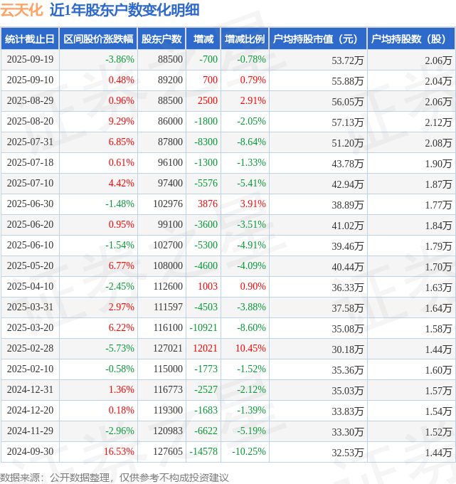 从股价来看,2025年9月10日至2025年9月19日,云天化区间跌幅为3.86%,在此期间股东户数减少700.0户,减幅为0.78%。