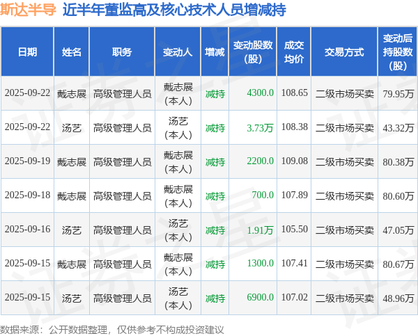 证券之星消息,根据9月23日市场公开信息、上市公司公告及交易所披露数据整理,斯达半导(603290)最新董监高及相关人员股份变动情况:2025年9月19日至2025年9月22日公司高级管理人员戴志展、高级管理人员汤艺共减持公司股份4.38万股,占公司总股本为0.0183%。变动期间公司股价下跌0.35%,9月22日当日收盘报108.19元。