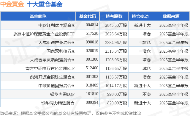 根据2025基金半年报公募基金重仓股数据,重仓该股的公募基金共133家,其中持有数量最多的公募基金为中欧基金的中欧红利优享混合A。中欧红利优享混合A目前规模为50.6亿元,最新净值2.1236(9月19日),较上一交易日上涨0.97%,近一年上涨51.91%。该公募基金现任基金经理为蓝小康。蓝小康在任的基金产品包括:中欧融恒平衡混合A,管理时间为2023年3月21日至今,期间收益率为48.48%;中欧价值回报混合A,管理时间为2023年6月9日至今,期间收益率为58.06%。