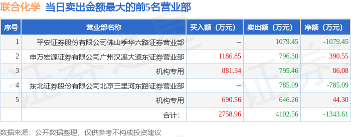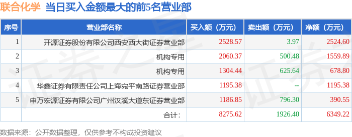 证券之星消息,沪深交易所2025年9月24日公布的交易公开信息显示,联合化学(301209)因日涨幅达到15%的前5只证券登上龙虎榜。此次是近5个交易日内第1次上榜。