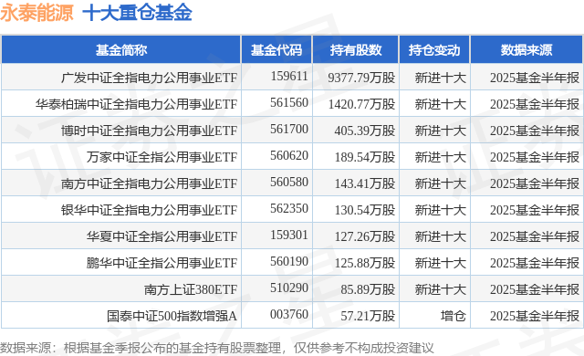 根据2025基金半年报公募基金重仓股数据,重仓该股的公募基金共12家,其中持有数量最多的公募基金为广发基金的广发中证全指电力公用事业ETF。广发中证全指电力公用事业ETF目前规模为33.14亿元,最新净值0.9956(9月22日),较上一交易日下跌0.7%,近一年上涨8.12%。该公募基金现任基金经理为陆志明。陆志明在任的基金产品包括:广发中证全指汽车指数A,管理时间为2021年6月17日至今,期间收益率为36.72%;广发中证全指建筑材料指数A,管理时间为2021年6月17日至今,期间收益率为-37.39%;广发中证全指家用电器ETF联接A,管理时间为2021年6月17日至今,期间收益率为11.71%;广发上证科创板50成分ETF,管理时间为2021年7月15日至今,期间收益率为-13.15%。