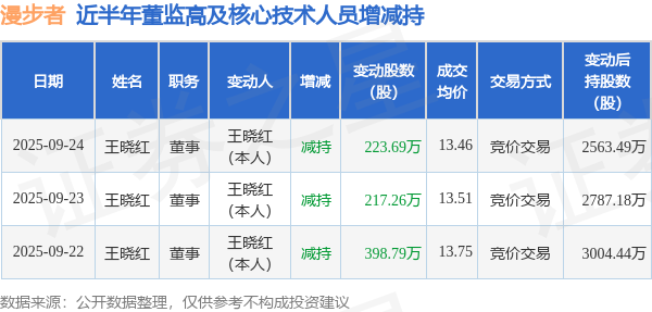 证券之星消息,根据9月25日市场公开信息、上市公司公告及交易所披露数据整理,漫步者(002351)最新董监高及相关人员股份变动情况:2025年9月24日公司董事王晓红共减持公司股份223.69万股,占公司总股本为0.2516%。变动期间公司股价下跌0.22%,9月24日当日收盘报13.52元。