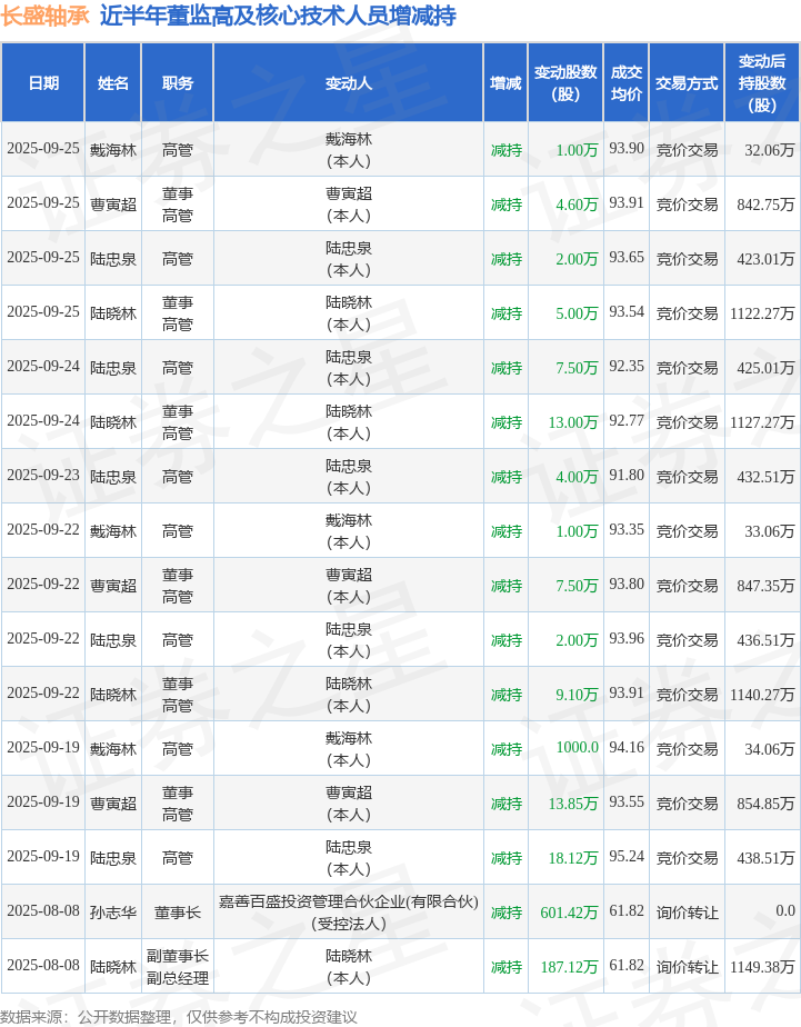 长盛轴承近半年内的董监高及核心技术人员增减持详情如下: