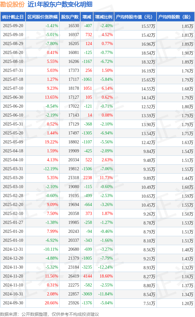 从股价来看,2025年9月10日至2025年9月20日,勘设股份区间跌幅为1.41%,在此期间股东户数减少407.0户,减幅为2.4%。