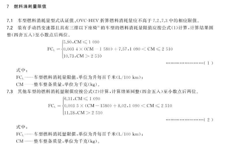 电量保持模式下,整备质量≤2510kg的车型:燃料消耗量需低于国标限值的70%;整备质量>2510kg的车型:燃料消耗量需低于国标限值的75%;最大设计总质量超3500kg的车型,燃料消耗量参照3500kg级国标限值执行。