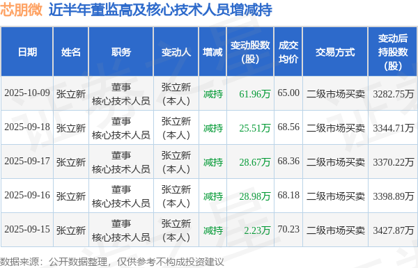 证券之星消息,根据10月10日市场公开信息、上市公司公告及交易所披露数据整理,芯朋微(688508)最新董监高及相关人员股份变动情况:2025年10月9日公司董事,核心技术人员张立新共减持公司股份61.96万股,占公司总股本为0.4719%。变动期间公司股价下跌0.36%,10月9日当日收盘报71.17元。