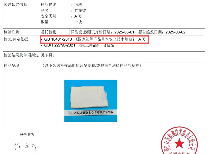 这款棉花被符合A类标准,大人小孩放心睡!