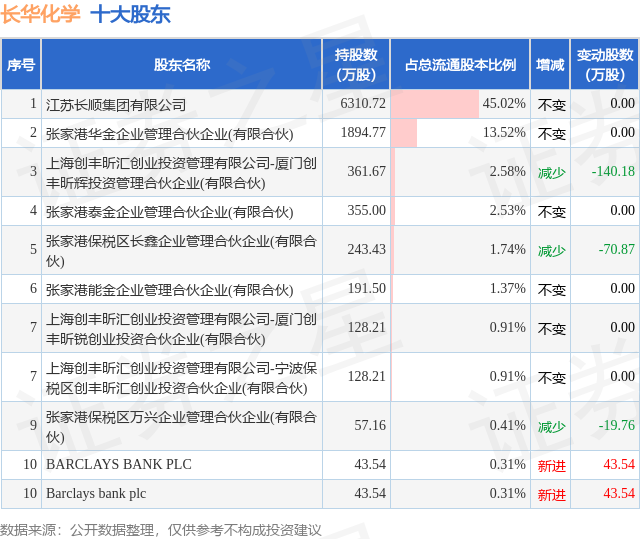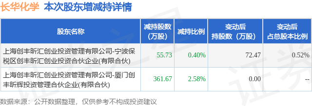 证券之星消息,10月9日长华化学发布公告《长华化学:关于股东股份减持计划实施完成的公告》,其股东上海创丰昕汇创业投资管理有限公司-宁波保税区创丰昕汇创业投资合伙企业(有限合伙)、上海创丰昕汇创业投资管理有限公司-厦门创丰昕辉投资管理合伙企业(有限合伙)于2025年9月26日至2025年9月30日间合计减持417.41万股,占公司目前总股本的2.9777%,变动期间该股股价上涨28.28%,截止9月30日收盘报37.65元。