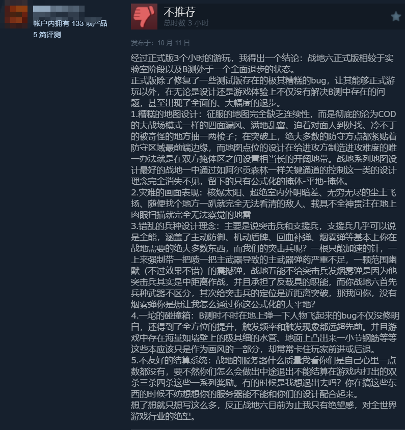 差评的问题主要集中在,《战地6》的地图设计比较糟糕,比如征服地图更趋近于COD的体验,整体缺乏连贯性,节奏过于紧凑,很难展现出此前战地系列大战场大气磅礴的游戏体验。兵种设计也过于混乱,还取消了兵种武器限制,支援兵能力出众过于强势,而突击兵甚至都没给配个烟雾弹。此外,像是连上不烂橘子服务器,武器配件,兵种技能解锁太肝,也成为被玩家吐槽最多的诟病。