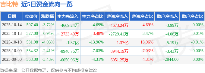 10月14日的资金流向数据方面,主力资金净流出4669.24万元,占总成交额4.69%,游资资金净流入4673.24万元,占总成交额4.69%,散户资金净流出3.99万元。