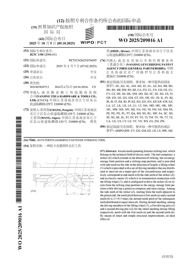 证券之星消息,根据企查查数据显示腾亚精工(301125)公布了一项国际专利申请,专利名为“一种防卡齿紧固件击打工具”,专利申请号为PCT/CN2025/076095,国际公布日为2025年10月9日。