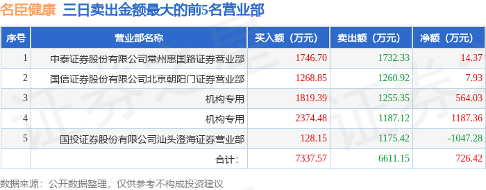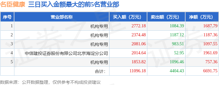 证券之星消息,沪深交易所2025年10月14日公布的交易公开信息显示,名臣健康(002919)因连续三个交易日内,涨幅偏离值累计达到20%的证券登上龙虎榜。此次是近5个交易日内第1次上榜。