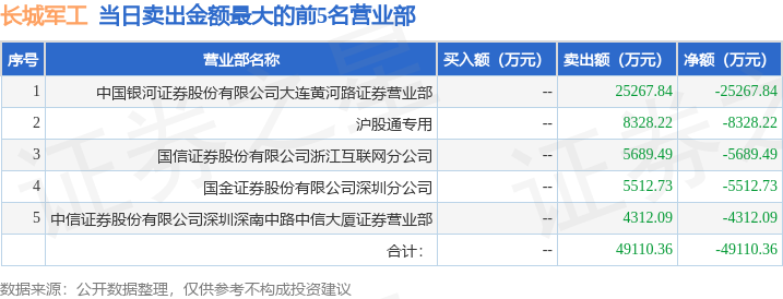 证券之星消息,沪深交易所2025年10月15日公布的交易公开信息显示,长城军工(601606)因有价格涨跌幅限制的日收盘价格跌幅偏离值达到7%的前五只证券登上龙虎榜。此次是近5个交易日内第2次上榜。