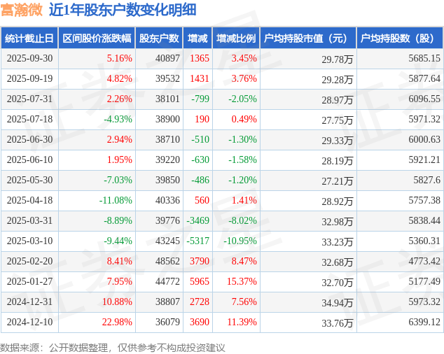 从股价来看,2025年9月19日至2025年9月30日,富瀚微区间涨幅为5.16%,在此期间股东户数增加1365.0户,增幅为3.45%。
