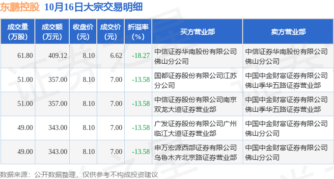 证券之星消息,10月16日东鹏控股发生大宗交易,交易数据如下: