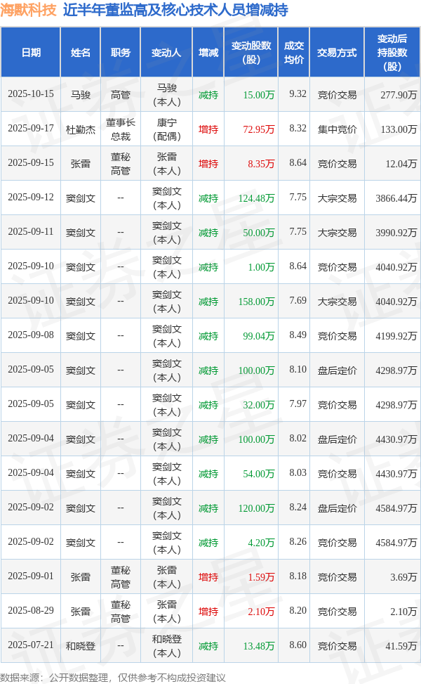 海默科技近半年内的董监高及核心技术人员增减持详情如下: