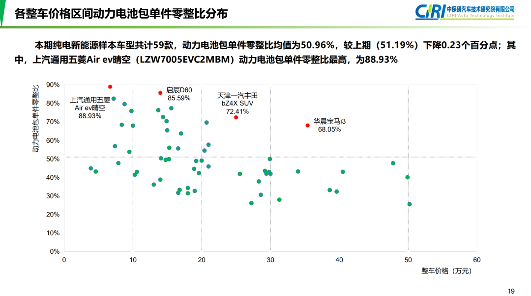 去年,中保研统计了市面上59款主流纯电车型,动力电池包价格平均占到整车价格的50.96%,甚至有车型占比到了88.93%,也就是说这车换电池的费用,基本等于换车了。