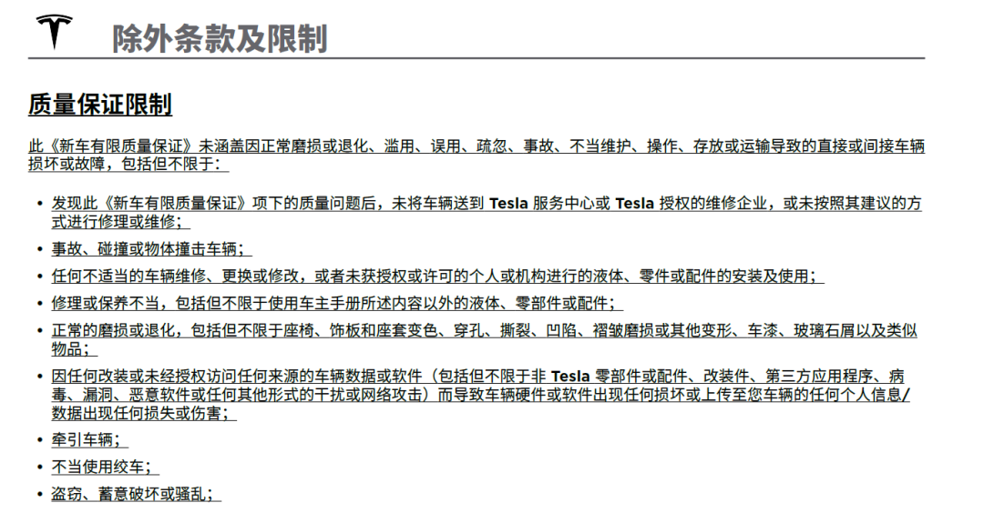 但享受原厂质保的前提是,你得全程在官方店做保养和维修,否则就会脱保。比如特斯拉的质保条例就说,如果没去特斯拉服务中心或授权维修企业,或者没按它建议的方式维修,这可能会影响质保。比亚迪的三电终身质保,也有类似的描述。