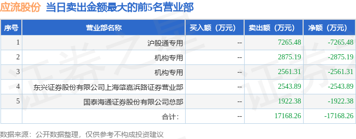 证券之星消息,沪深交易所2025年10月17日公布的交易公开信息显示,应流股份(603308)因有价格涨跌幅限制的日收盘价格跌幅偏离值达到7%的前五只证券登上龙虎榜。此次是近5个交易日内第1次上榜。