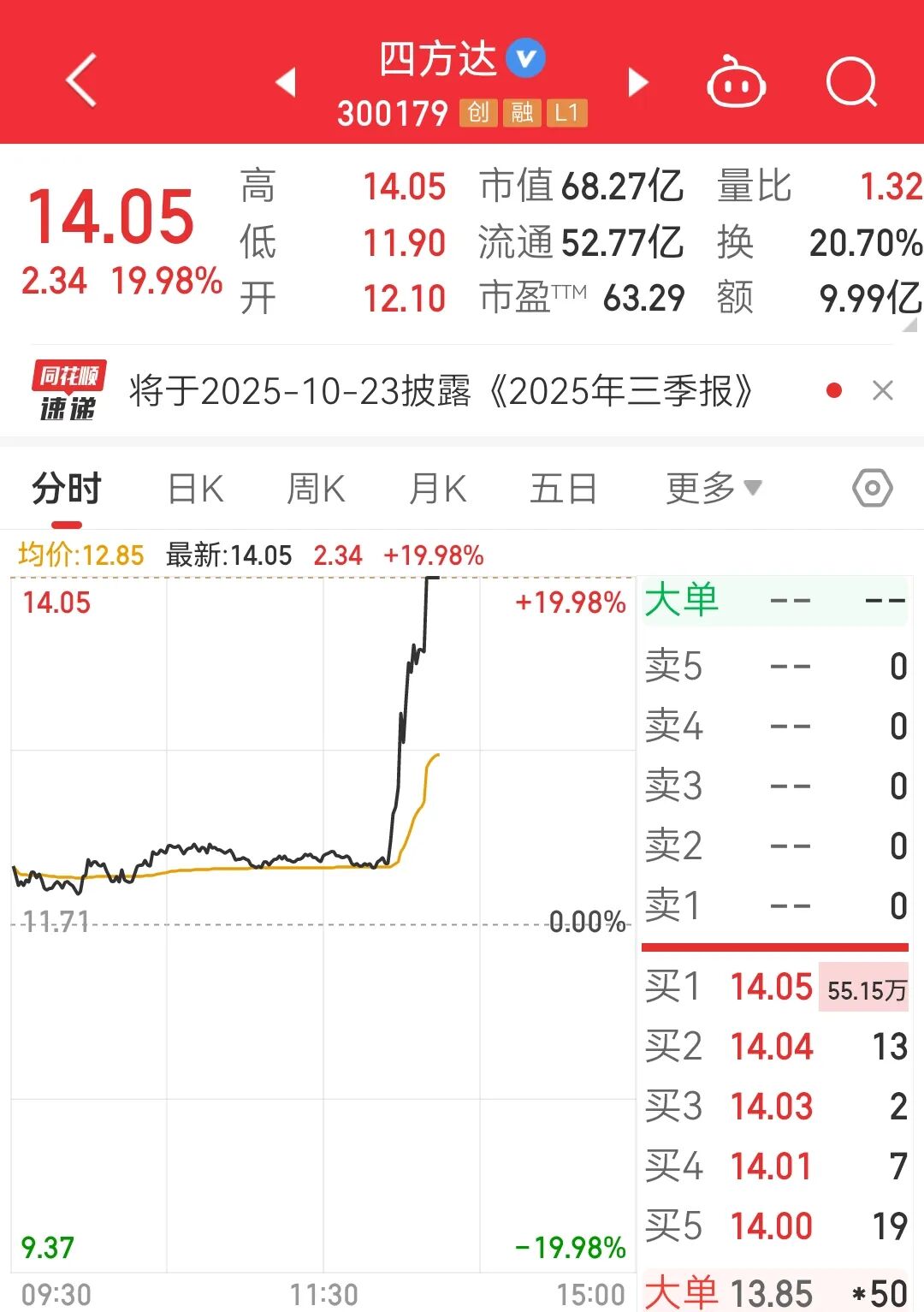 10月20日午后,培育钻石概念突然大幅拉升。四方达(300179)午后约13:24左右直线拉升,由涨幅不到4%,迅速拉升至20cm涨停板,盘中涨停板封单一度超过65万手。