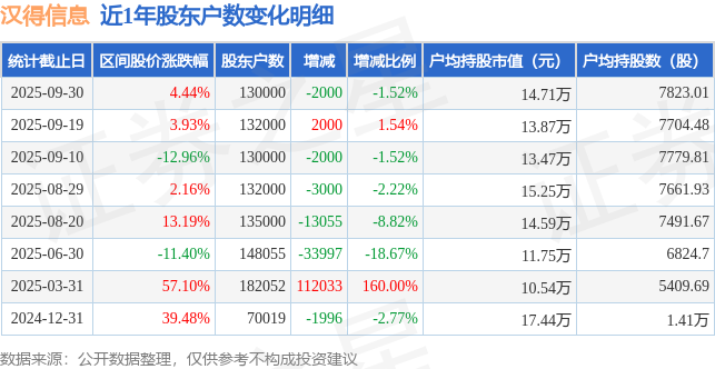 从股价来看,2025年9月19日至2025年9月30日,汉得信息区间涨幅为4.44%,在此期间股东户数减少2000.0户,减幅为1.52%。