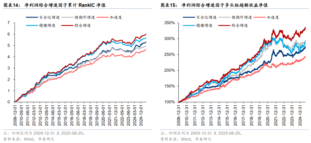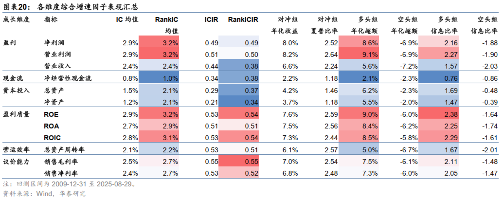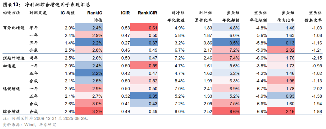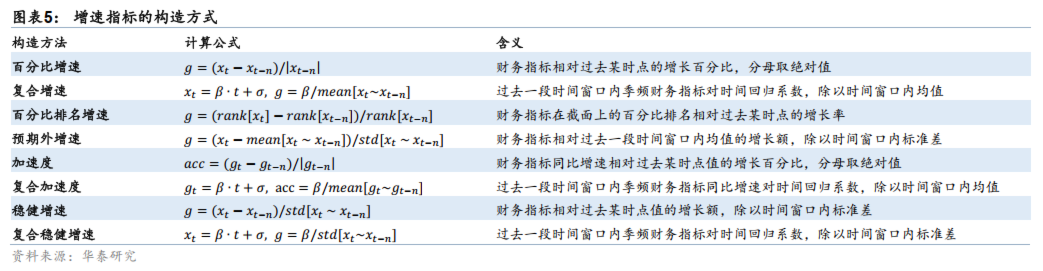 1、因子构造:除常规的同比、环比百分比增速外,尝试构造百分比排名增速、预期外增速、稳健增速、加速度等多种增长衡量指标,复合得到单个指标的综合增速;