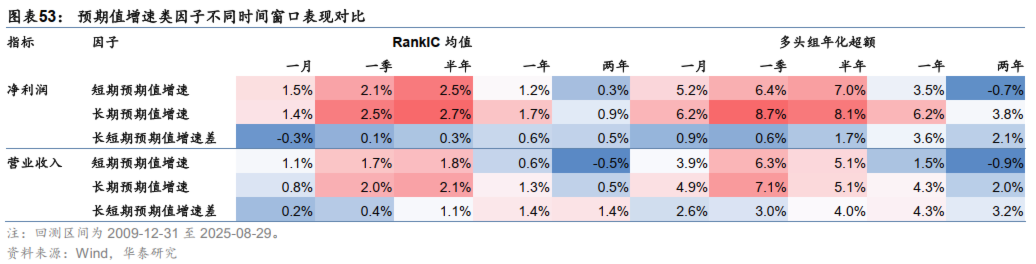 结果表明,预期值增速因子在与企业业绩公布频率较为同步的季度、半年频率表现较优,而长短期预期值增速差在一年左右的窗口更优,且净利润与营业收入因子相比更优。综合来看,后文分别选取一季、一年作为增速、增速差因子计算的时间窗口。