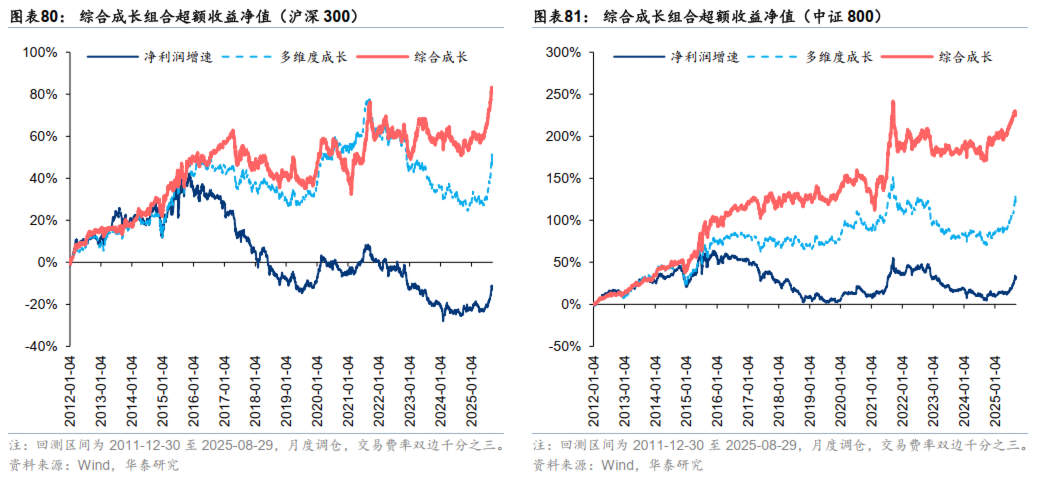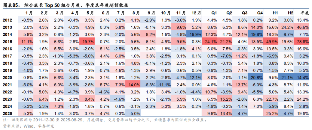 可以发现,综合成长组合相对国证成长全收益指数在全区间能获取可观超额,年化超额收益率高达17%,信息比率超1。同时,组合相对基准超额在时序上也较为稳定,除2020年跑输基准外,其余年度均获正超额,2025年至8月底超额收益接近20%。