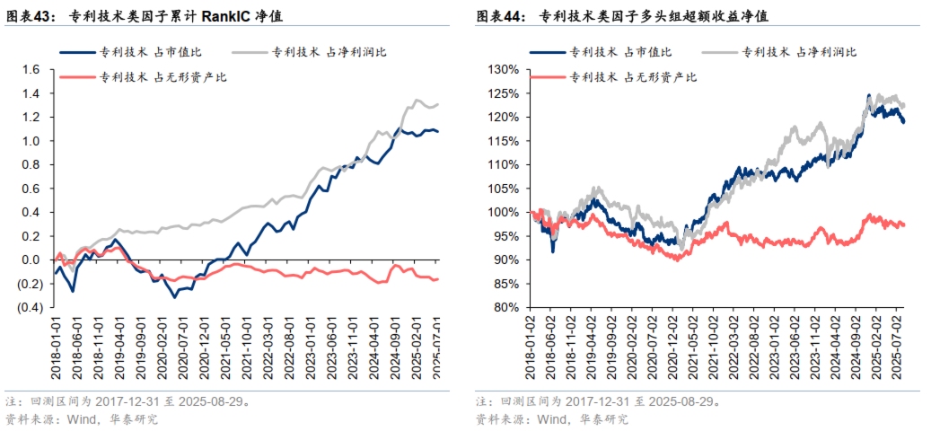 除了费用化的研发开支,企业无形资产的“技术含量”也可体现出企业研发的转化效率和科技实力。本节挑选无形资产中专利权、专利技术、软件、数据资源等科目作为企业的专利技术资产,构造一系列专利技术因子进行测试,结果如下。