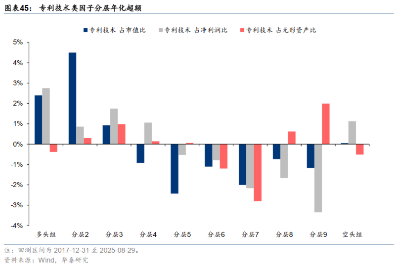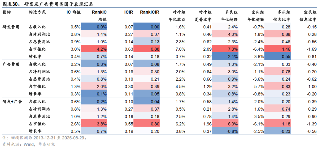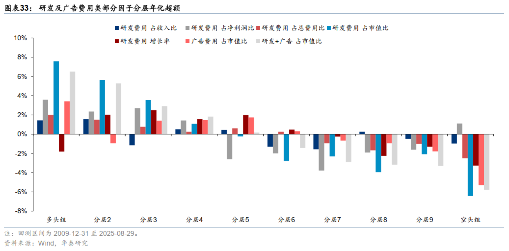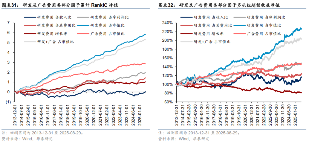 从IC和多头组表现时序变化上看,研发/广告费用占市值比因子可获稳定收益,研发费用占收入/净利润比类因子波动较大,但成长属性明显,2025年以来表现尤为突出;而研发费用增长类因子多头组稳定跑输,而第2至5层超额为正,或表明研发费用投入过度企业在短期内对股价总体呈现负面影响。